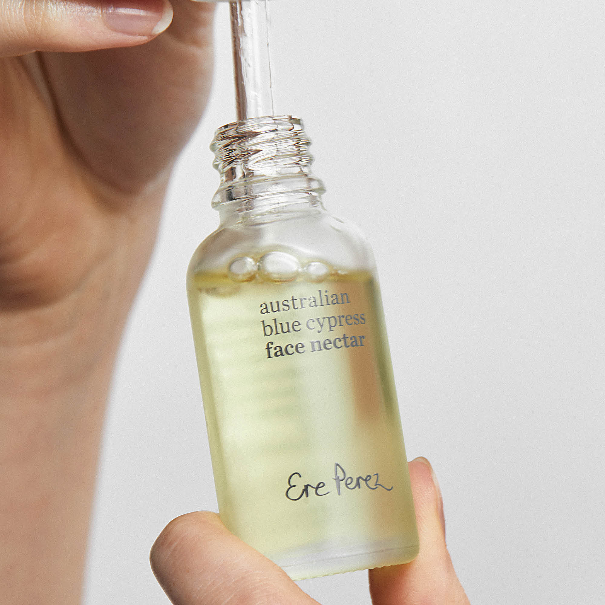 Australian Blue Cypress Face Nectar - caprylic/capric triglyceride, vitis vinifera (grape) seed oil, oryza sativa (native rice) bran oil, simmondsia chinensis (jojoba) seed oil, camellia oleifera (camellia) seed oil, tocopherol (vitamin E), callitris intratropica (australian blue cypress) wood oil, cedrus atlantica (cedarwood) wood oil, jasminum sambac (jasmine) flower extract, boswellia carterii (frankincense) oil.