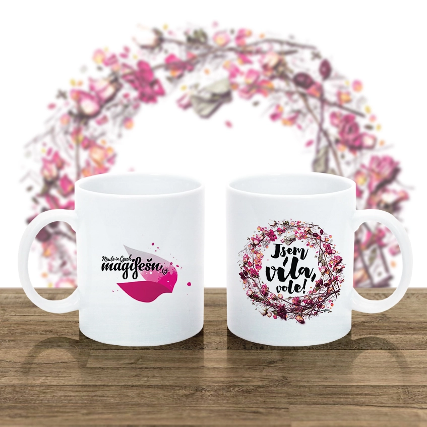 Stylový hrnek s autorskou fotografií. Něžný věneček z růží, šípků a lístků je doplněn uvnitř kruhu vtipným nápisem "Jsem víla, vole!".